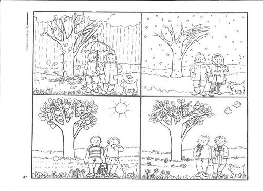 YA HEMOS VISTO LAS CARACTERÍSTICAS PRINCIPALES DE LAS ESTACIONES DEL AÑO, LOS DIFERENTES FENÓMENOS ATMOSFÉRICOS QUE PRESENTAN CADA UNA DE ELLAS Y EL IMPORTANTE PAPEL DEL SOL EN NUESTRAS VIDAS Y EN LA NATURALEZA. INVITO A MIS ALUMNOS/AS A SER CREATIVOS Y A QUE COLOREEN COMO MÁS LES GUSTE LOS CUATRO DIBUJOS REPRESENTATIVOS DE LAS CUATRO ESTACIONES.